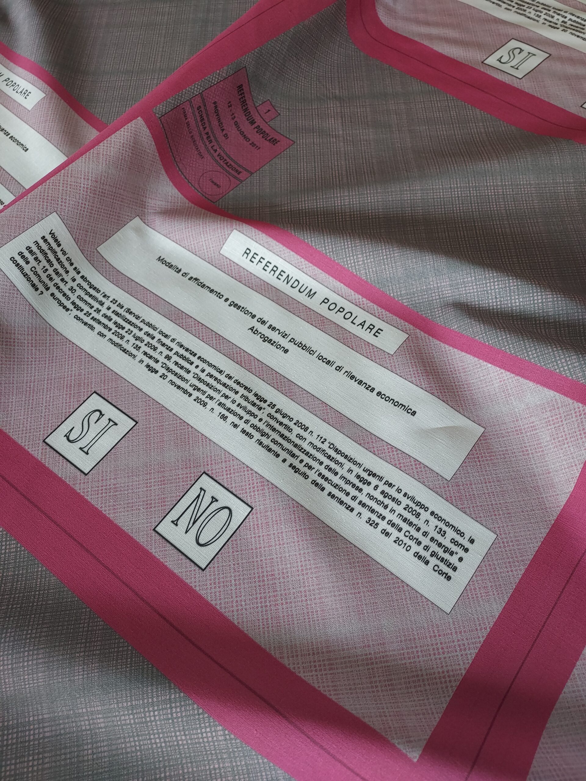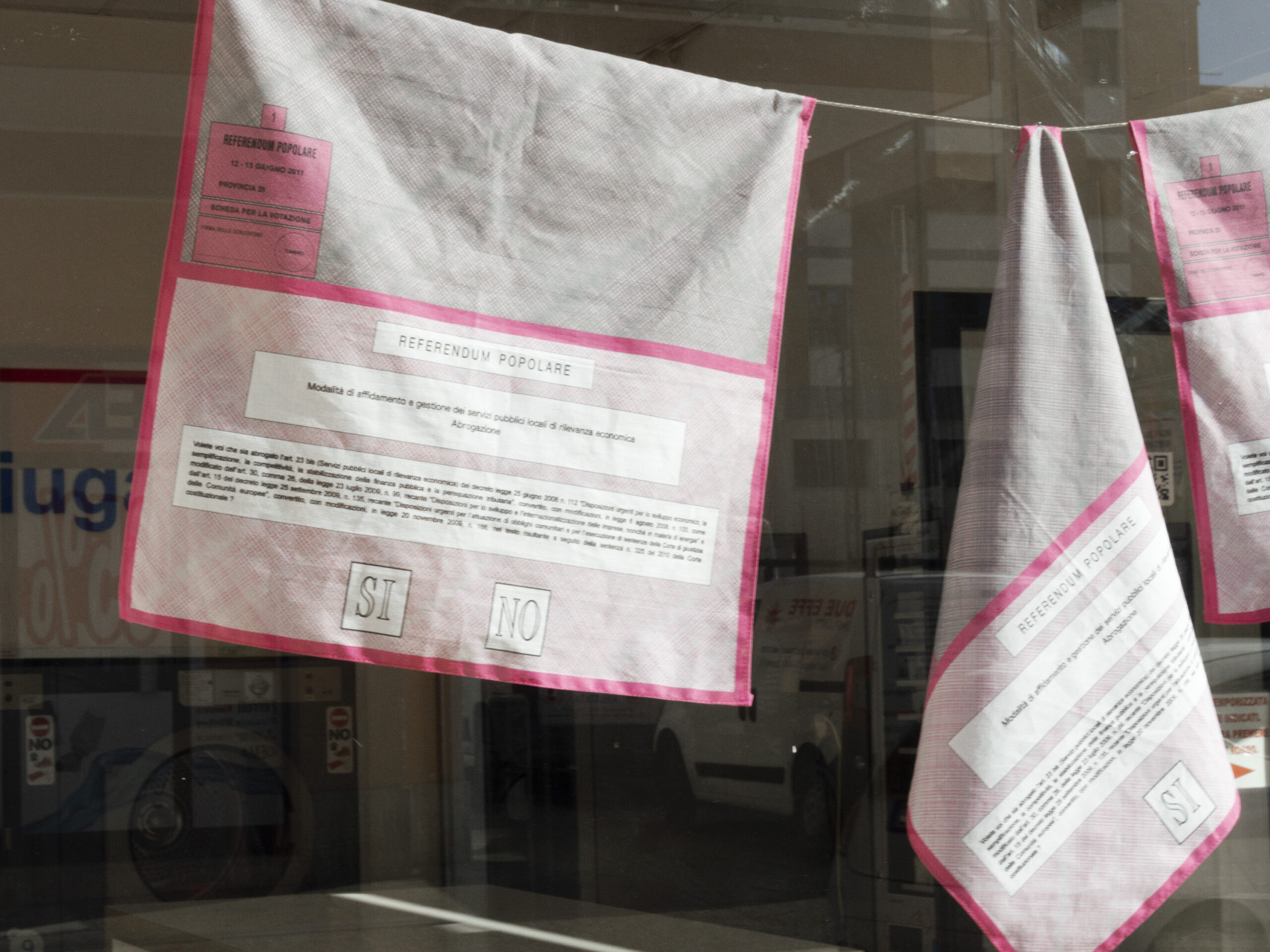 For the exhibition’s opening, Alberico creates a space for debate and reflection on water as a common good, involving representatives of the Abruzzo Forum and presenting works that will be offered to visitors in exchange for a symbolic donation to the association. The artist reimagines the 2011 ballot papers as fabric handkerchiefs, materializing a metaphor: he assigns an insufficient plasticity to that condition which arises whenever “a democratic change is blocked or hollowed out, popular consensus is extorted, manipulated, or hijacked by its interpreters” (M. Bascetta). At the same time, however, he opens up a dialectical dimension that we are invited to enter and contribute to.