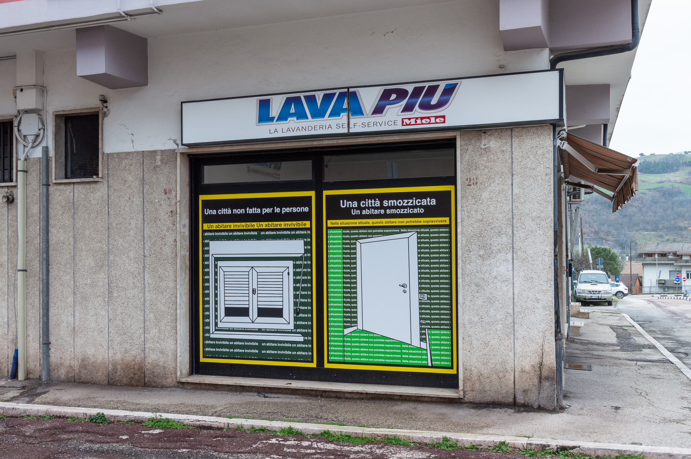 Se, secondo il celebre slogan di Ugo La Pietra, “abitare è essere ovunque a casa propria”, Mariani denuncia l’impossibilità di trovare cittadinanza sia nello spazio privato e domestico sia in quello pubblico. Partendo dalla propria esperienza di studente fuori sede, l’artista interpreta il senso di smarrimento “di chi, per scelta o necessità, vive fuori dal proprio luogo di origine, trovandosi completamente decentrato”. Come nella Casa dello Studente, evocata dalla finestra e dalla porta, abbozzate schematicamente. Ma anche negli attraversamenti tra l’abitazione e i poli universitari o il centro della città (L’Aquila è qui simboleggiata dai colori verde e giallo). Una città il cui tessuto urbano e sociale sono stati pesantemente ridisegnati e messi in discussione dagli eventi sismici del 2009.