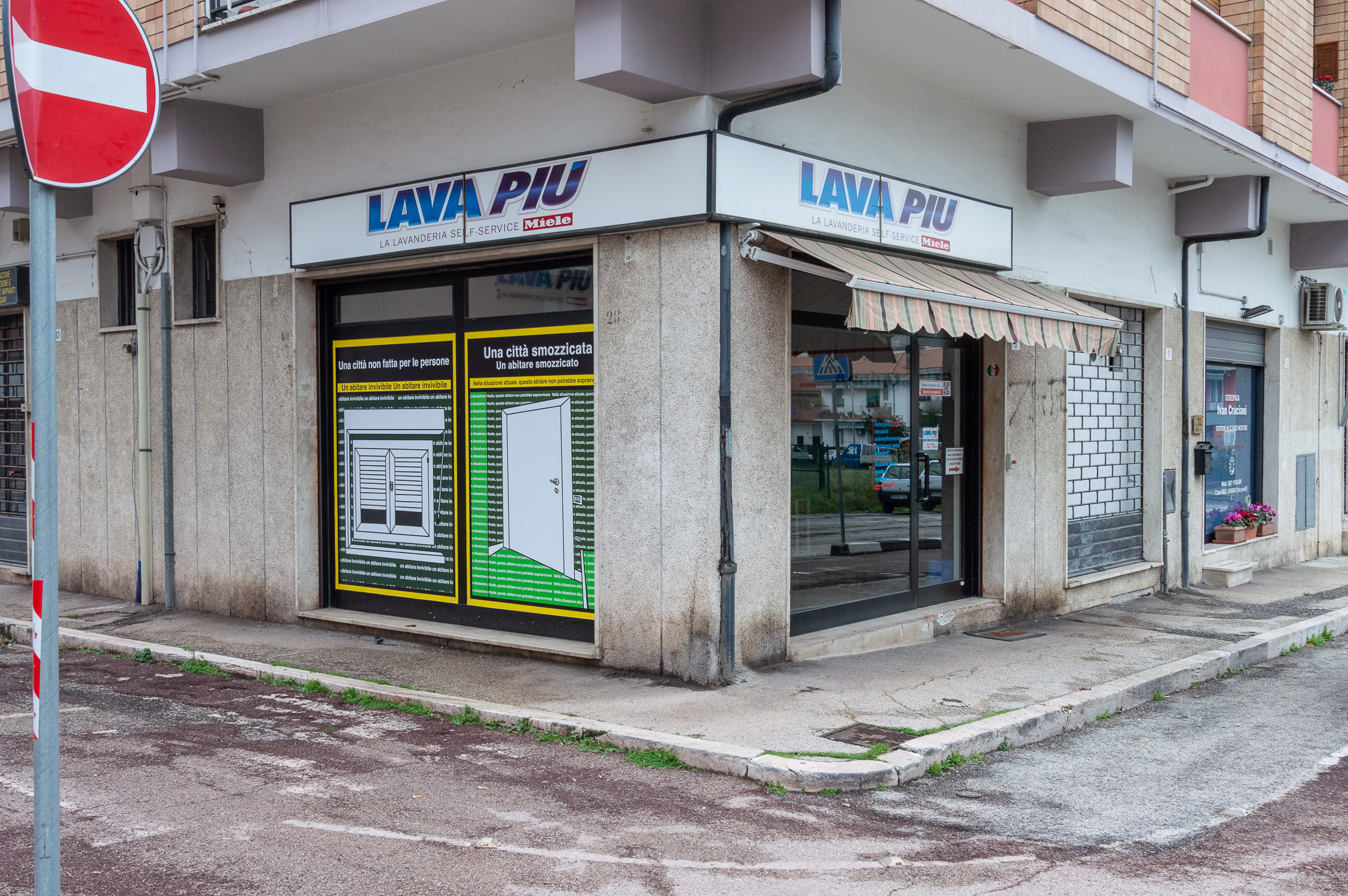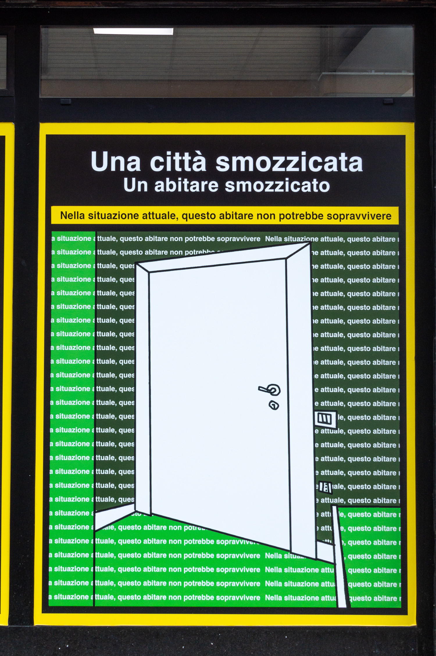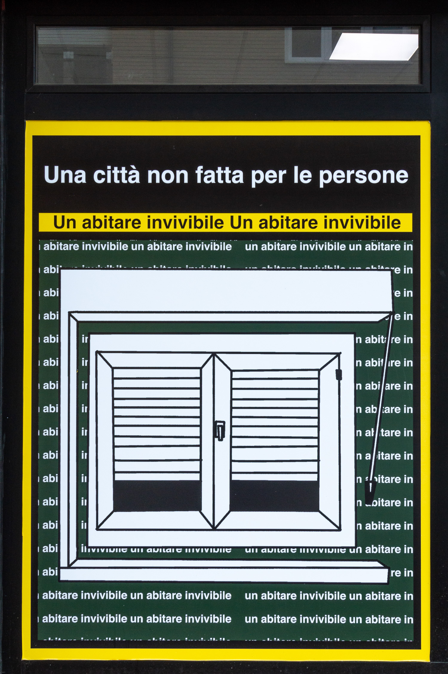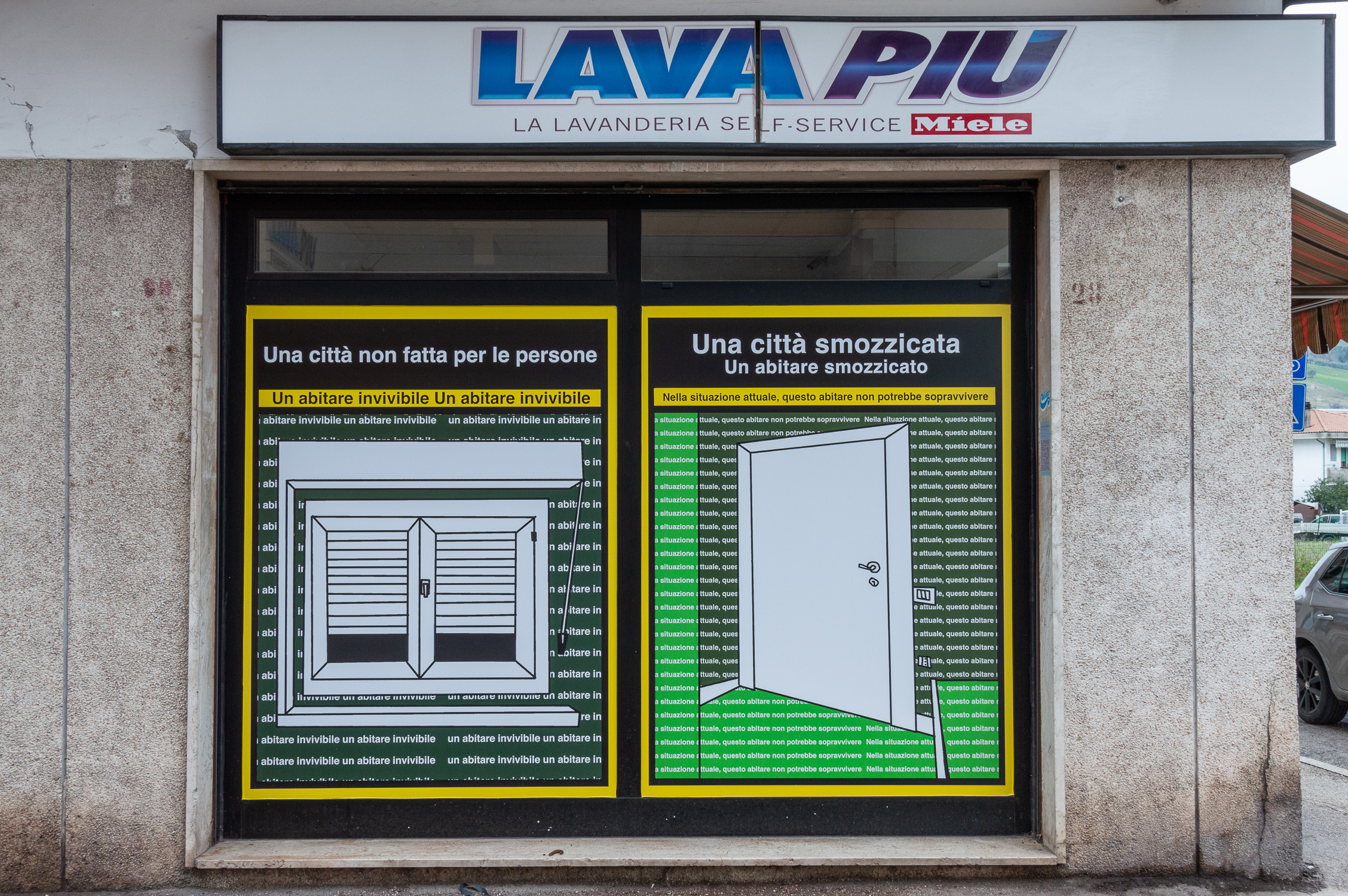 Mariani presenta due immagini grafiche ispirate all’estetica dei pacchetti di sigarette: da una parte la stilizzazione digitale di una finestra, dall’altra quella di una porta. Entrambi gli elementi sono sormontati da due scritte, che ricordano il linguaggio degli avvertimenti sulle confezioni di tabacco: Una città non fatta per le persone / un abitare invivibile – Una città smozzicata / un abitare smozzicato.